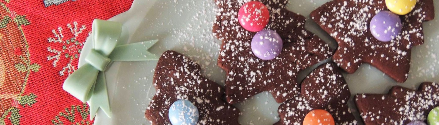 Deliziosi biscottini al cacao profumati alla mandorla, realizzati a forma di alberello e decorati con bottoncini colorati di cioccolato, in occasione delle festività natalizie. Ideali per confezionare dei graziosi pacchettini regalo!