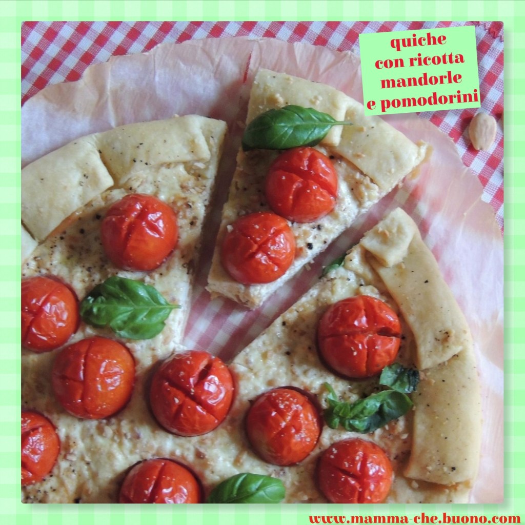 Friabile pasta brisée racchiude un cuore morbido di ricotta, arricchito da una manciata di mandorle tostate e tritate… i pomodorini interi e appena incisi e una spolverizzata di pepe guarniscono la superficie di questa profumatissima torta salata! Ideale per cena o servita in piccole porzioni come finger-food! ^_^