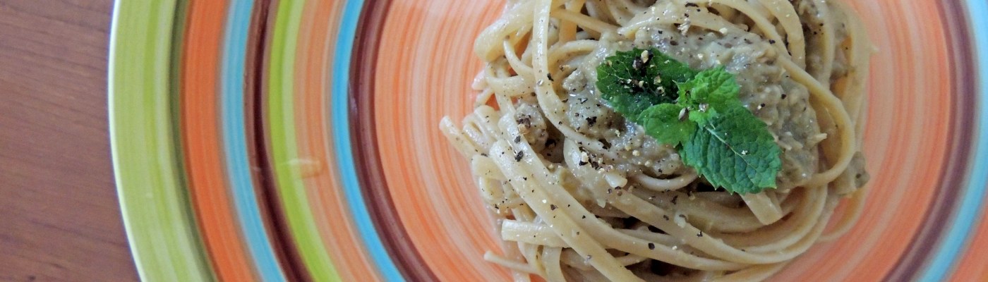 Primo piatto delicato e profumato! Pesto realizzato con polpa di melanzane, mandorle e menta. Condimento ideale per avvolgere un formato di pasta lunga, meglio se integrale o per accompagnare crostini di pane! ^_^