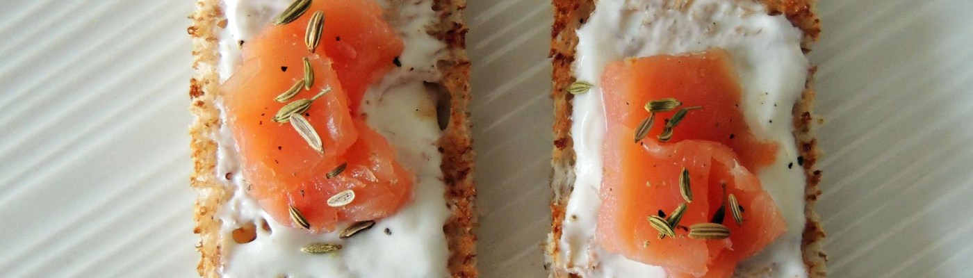 Dividere e tostare il pane in cassetta. Tagliare il salmone a striscioline. Spalmare un cucchiaino di salsa allo yogurt sul pane dorato, e qualche strisciolina di salmone, un pizzico di pepe, una spruzzata di lime e qualche semino di finocchio.
