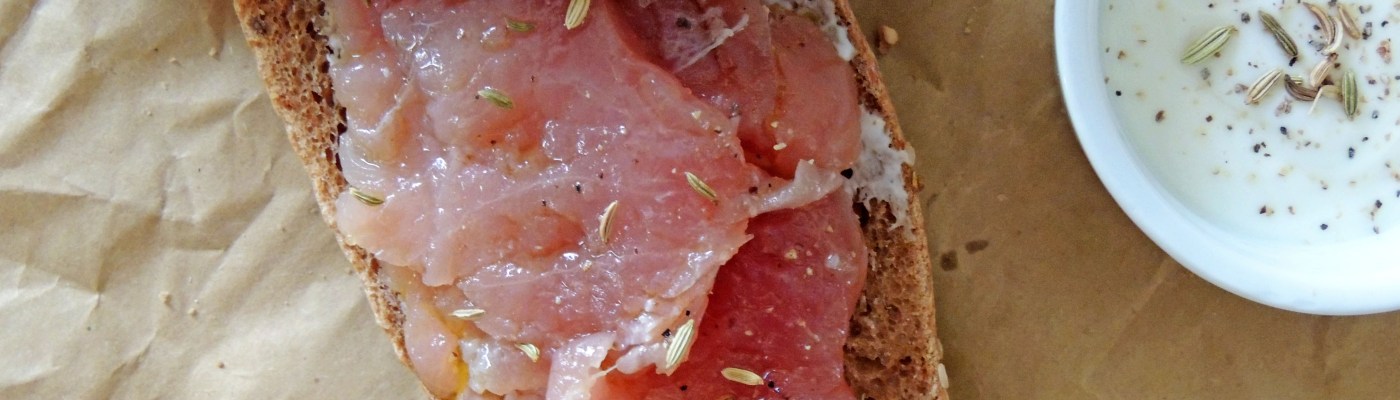 Pane ai cereali farcito con carpaccio di tonno fresco marinato accompagnato da un velo di gradevolissima salsa yogurt. Stuzzicante! 😋