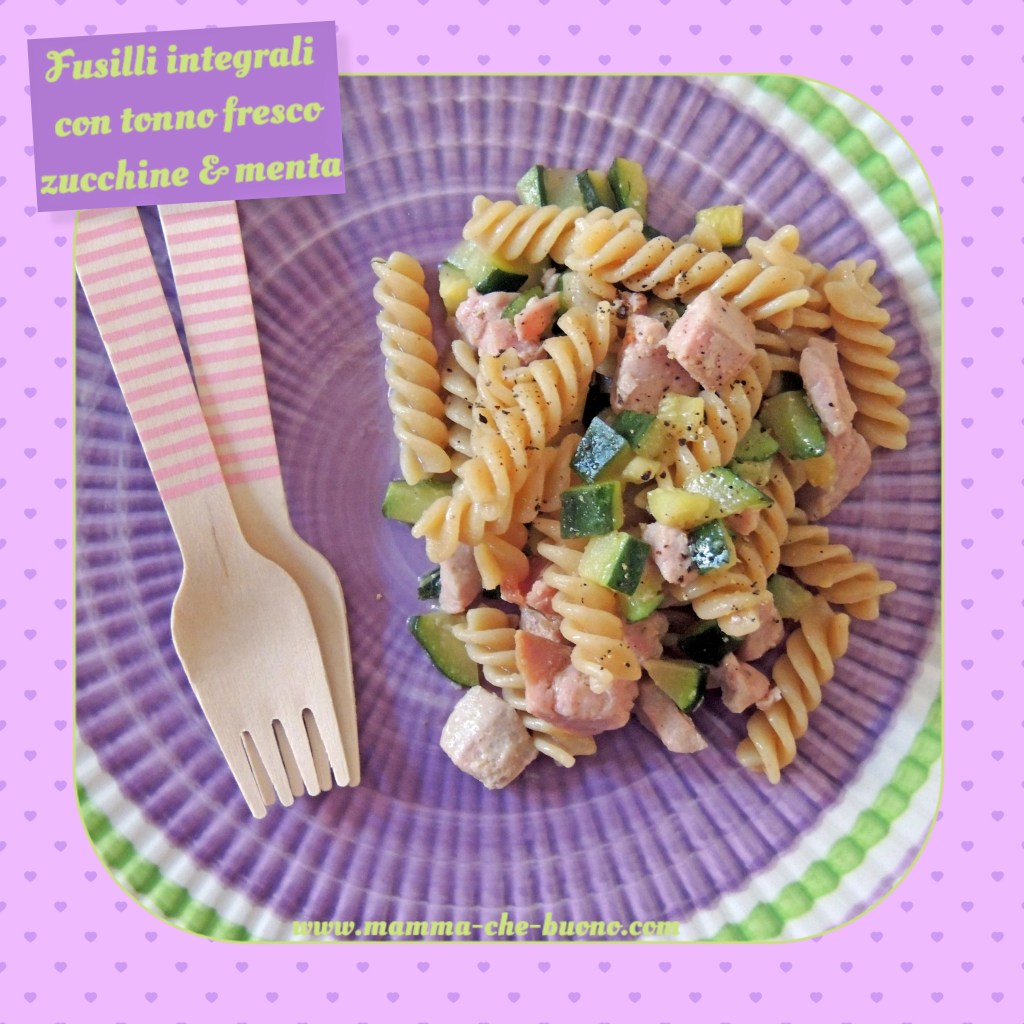Primo piatto di pesce, delicato e completo. Fusilli integrali conditi con una dadolata di tonno fresco e zucchine profumate alla menta. Per un pasto equilibrato e gradevole!