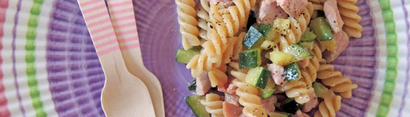 Primo piatto di pesce, delicato e completo. Fusilli integrali conditi con una dadolata di tonno fresco e zucchine profumate alla menta. Per un pasto equilibrato e gradevole!