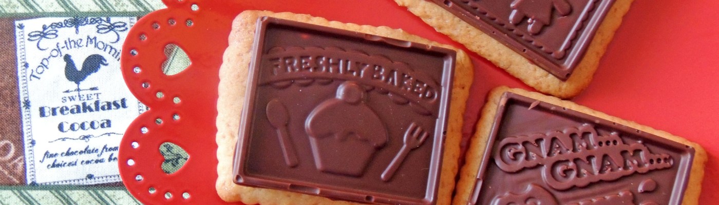 Golosi biscotti, composti da una base di biscotto e una placchetta decorata di cioccolato fondente! Realizzati con un apposito kit, sono una vivace merenda o confezionati singolarmente un dolcissimo pensiero ^_^