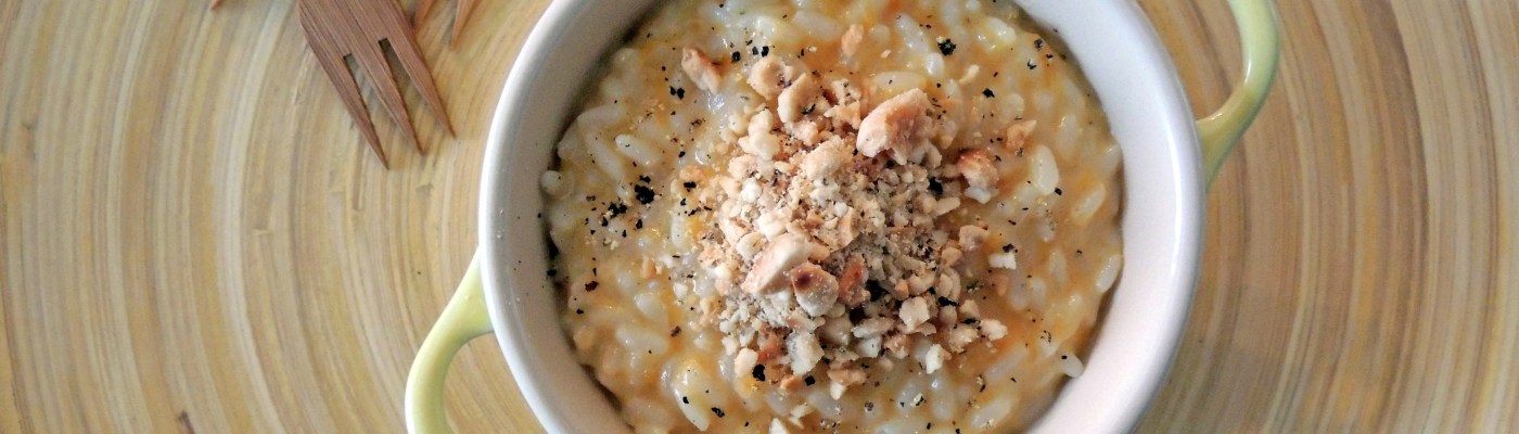Delicato risotto alla zucca, mantecato con un cucchiaio di formaggio spalmabile allo yogurt e guarnito con una cascata di granella di mandorle tostate. Profumato e stuzzicante! 😋