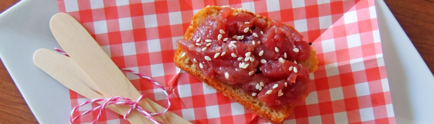 Soffici fettine di plum-cake preparato con farina ai cereali e parmigiano, farcite con una dadolata di tonno fresco marinato con olio e lime e guarnito con semini di sesamo. Fresco ed invitante finger-food, ideale per un aperitivo estivo!