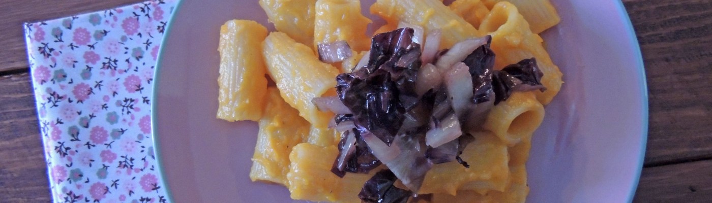 Primo piatto autunnale che unisce la dolcezza della zucca alla nota amarognola del radicchio. Un formato di pasta spesso che abbraccia bene il condimento. Un piatto colorato, leggero e goloso! 😊
