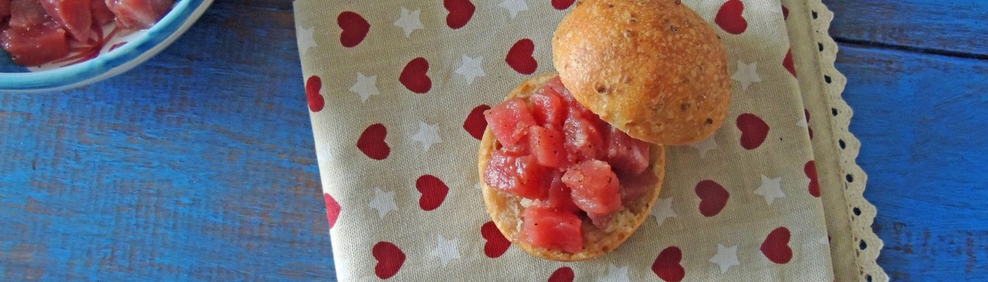 Piccoli panini ai semi di soia farciti con una dadolata di tonno fresco condito con olio, pepe e una spruzzata di limone. Ideali per un aperitivo a base di pesce! 😋