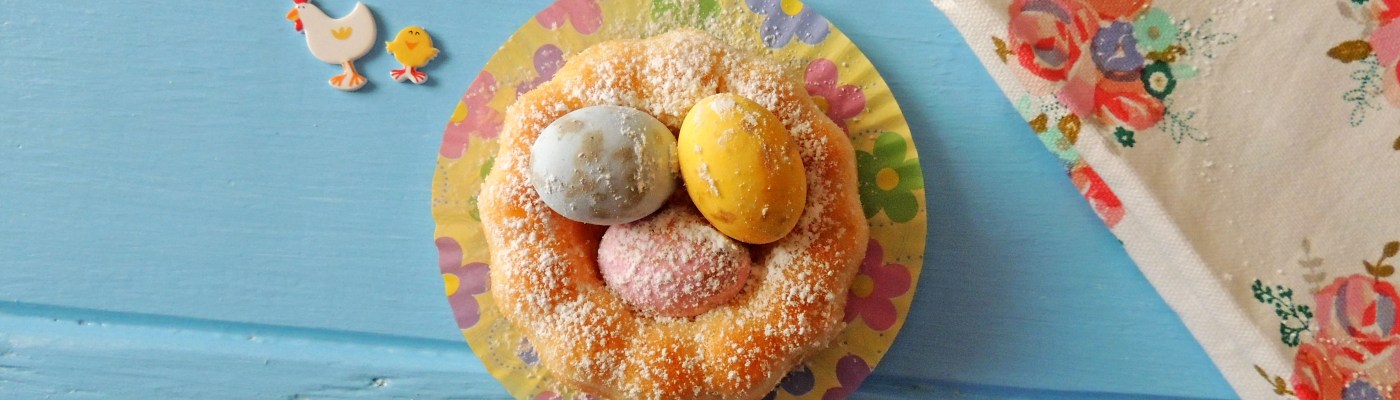 Soffici ciambelline profumate alla vaniglia e preparate con acqua e olio di semi. Decorate nel mezzo con alcuni ovetti di zucchero colorati ripieni di cioccolato. Leggere e delicate per la colazione o la merenda, vivaci per essere confezionate e regalate in occasione della Pasqua. 😊