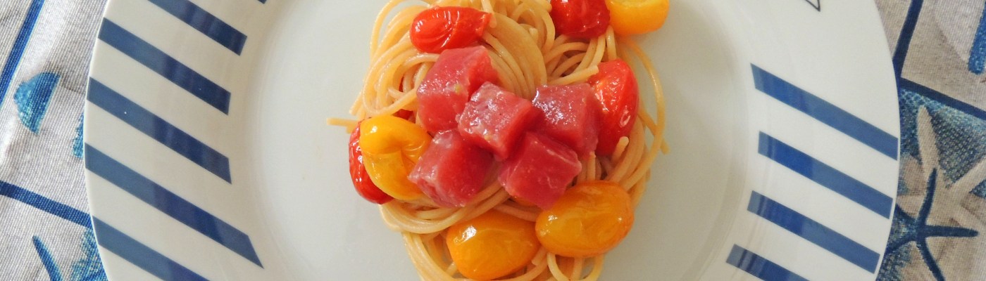 Primo piatto di pesce, leggero, colorato e raffinato. Spaghetti integrali conditi con pomodorini rossi e gialli profumati al basilico, passati appena in padella e guarniti con una dadolata di tonno fresco marinato. Ideali per una cena estiva. 💙