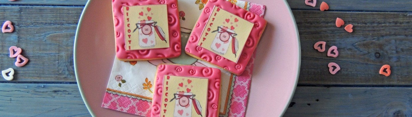 Stendere la pasta di zucchero con un mattarello liscio, poi premere con un mattarello disegnato per rilasciare delle piccole decorazioni sulla pasta di zucchero, ritagliare dei quadrati con lo stesso taglia-pasta dei biscotti. Unire con un velo di gelatina alimentare la pasta di zucchero al biscotto e poi la stampa alla superficie di zucchero. Lasciar asciugare.