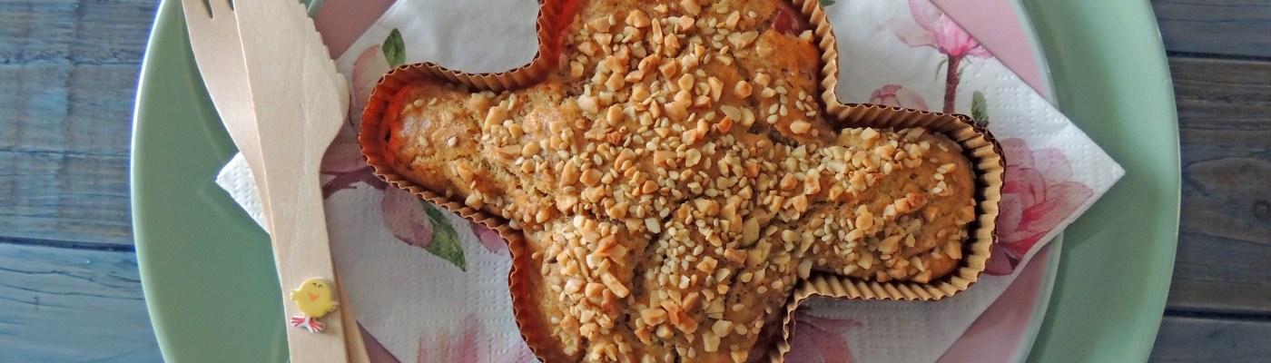Versare il preparato all’interno di un paio di stampini di carta per colombine, guarnire la superficie con le granella di mandorle, i semini di sesamo e un pizzico di pepe. Infornare a 180-200 gradi per circa 20-25 minuti.