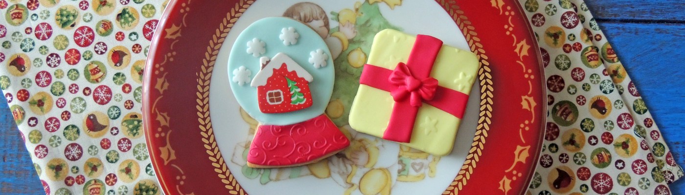 Per la pallina di vetro ho rivestito la base con pasta di zucchero rossa (decorata con un piccolo mattarello decorativo) e la parte superiore con pasta di zucchero celeste. Ho decorato con una casettina di zucchero e fiocchettini di neve piccini di zucchero (aiutandomi con un velo di gelatina alimentare per mettere insieme le varie parti).