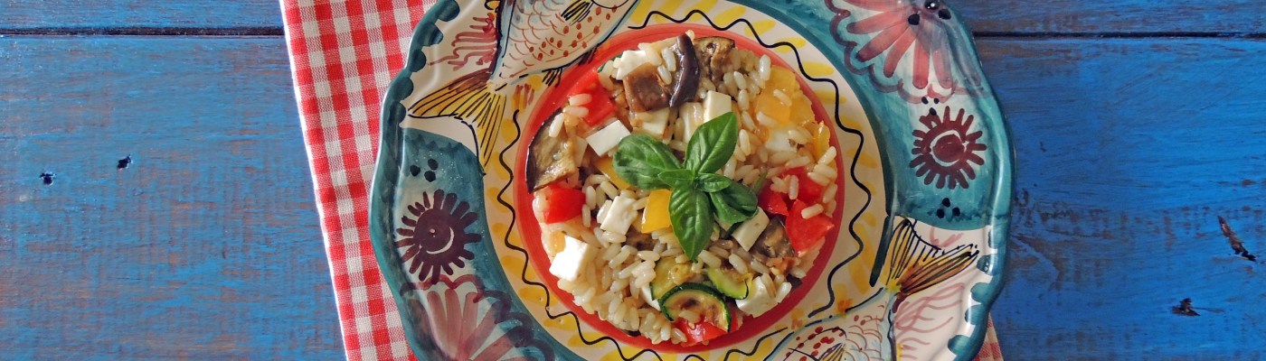 Insalata di riso (integrale) condita con ortaggi grigliati, pomodorini datterini (rossi e gialli) e dadini di formaggio primo sale. Un primo piatto, fresco, leggero e colorato. Ideale per un pranzo estivo o per un pic-nic al mare😊.