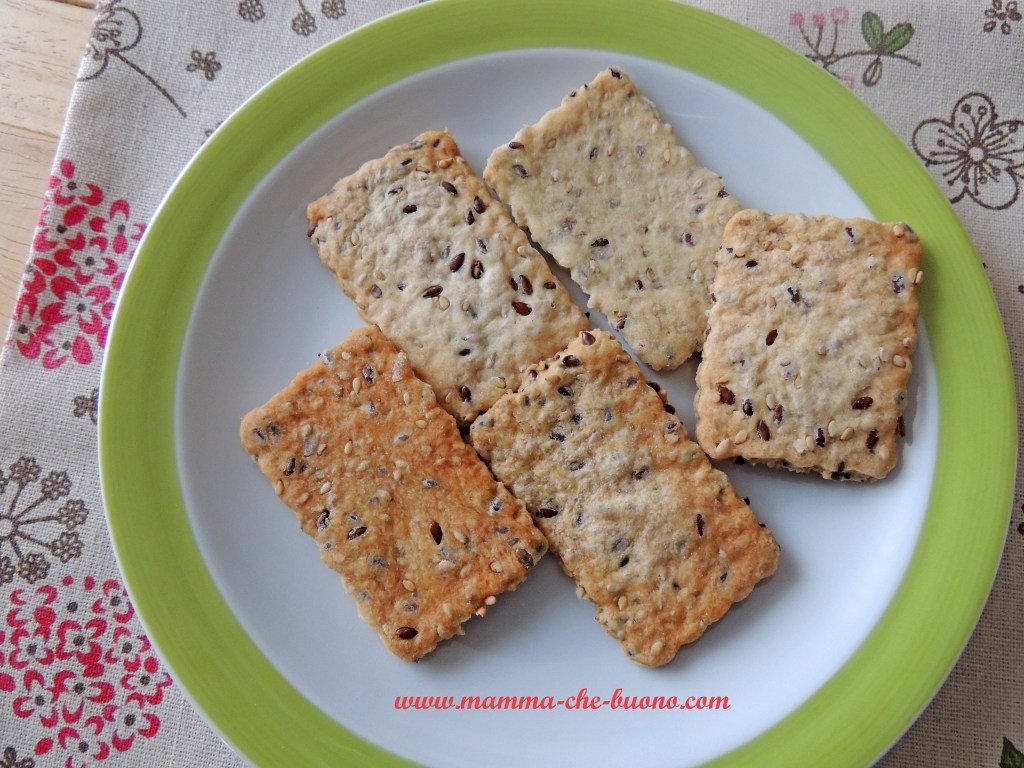Sfiziosi crackers, leggermente dorati, molto croccanti e arricchiti da semi di lino e sesamo. Ideali da sgranocchiare, per accompagnare formaggi spalmabili o per sostituire il pane.