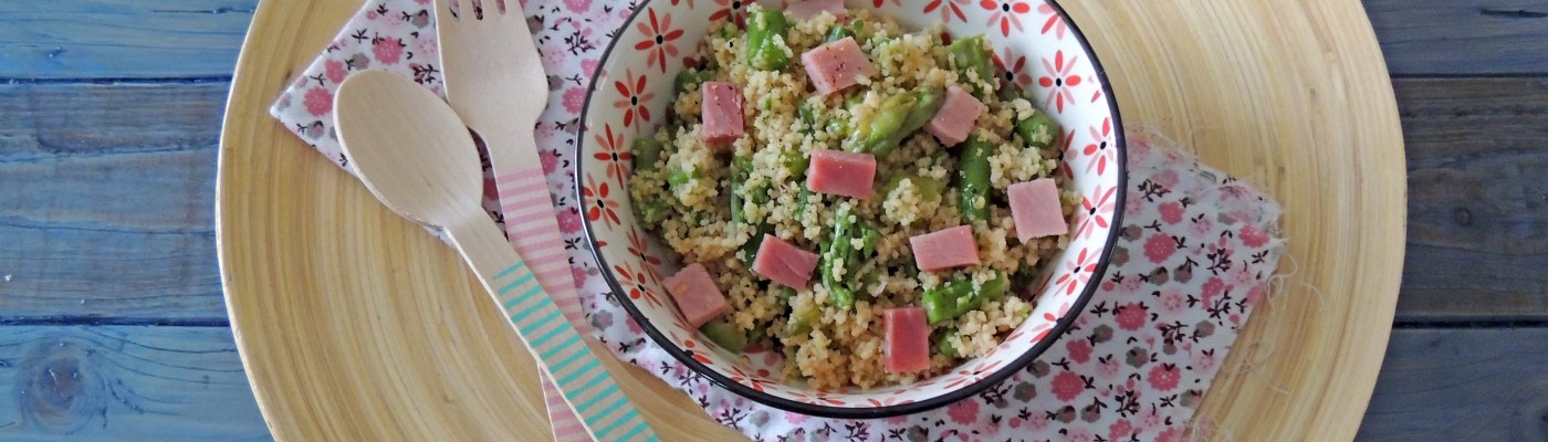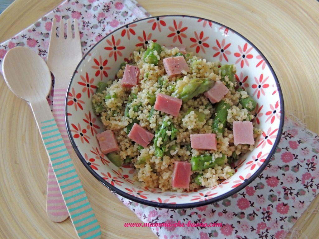 Cous cous ai cereali (grano duro, farro, kamut, integrale) condito con pezzettini di asparagi lessi, dadini di prosciutto cotto, un giro di olio crudo e un pizzico di pepe. Servito tiepido o freddo è un primo piatto leggero e goloso.
