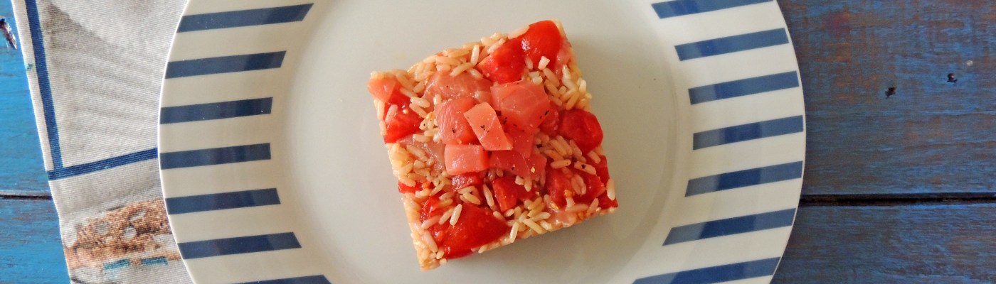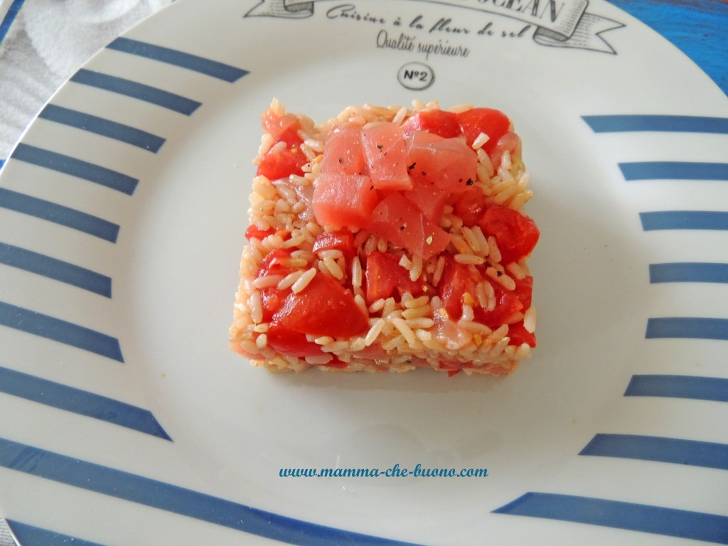 Primo piatto di pesce, fresco e invitante. Riso integrale condito con una dadolata di tonno fresco e pomodorini, condito con olio, pepe e una spruzzata di limone. Ideale per un piacevole pranzo estivo!