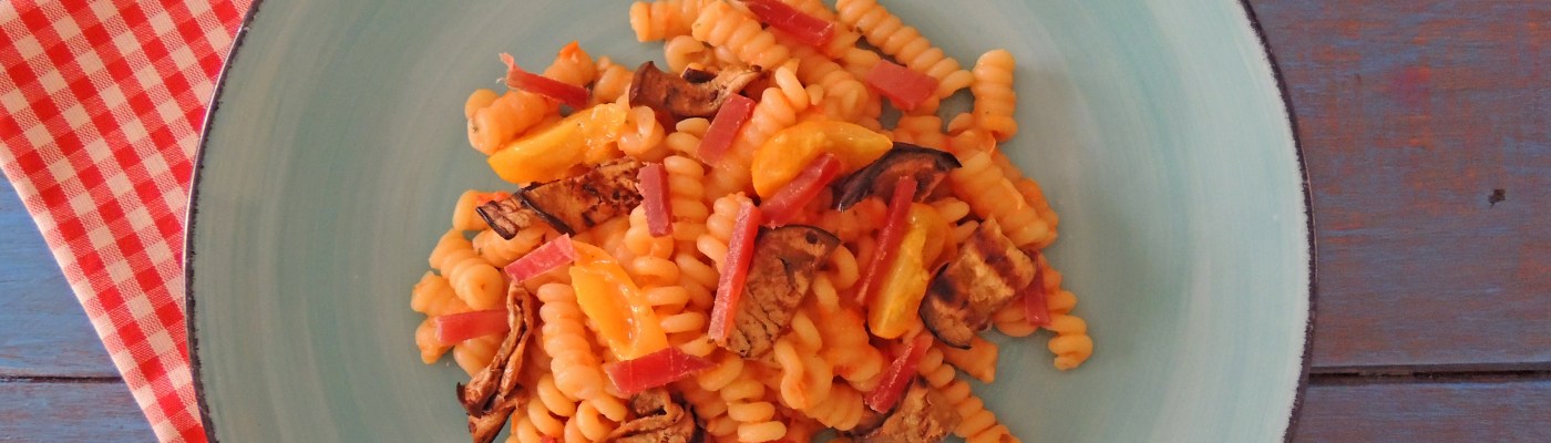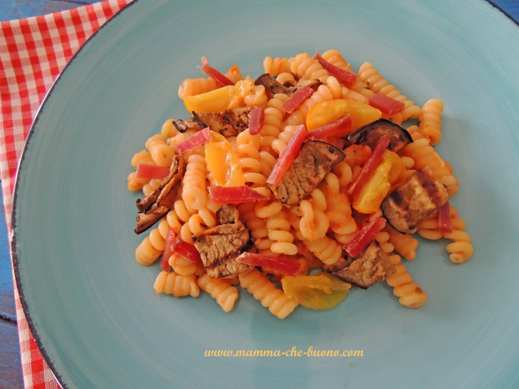 Unire la pasta alla crema di pomodorini, amalgamare. Aggiungere i pezzetti di melanzane e i bastoncini di prosciutto. Servire e gustare!