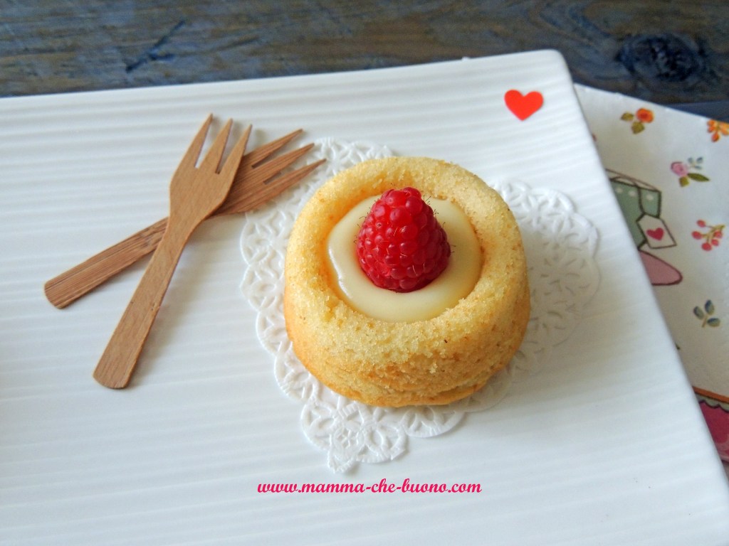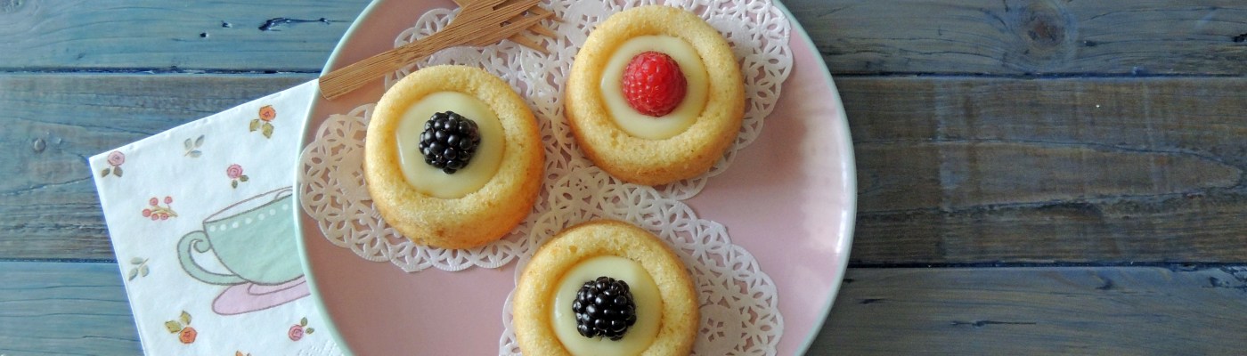 Soffici tortine farcite con crema pasticcera e guarnite con una mora o un lampone. Servite fresche sono un goloso fine pasto o perfette monoporzioni per arricchire un buffet di dolci.