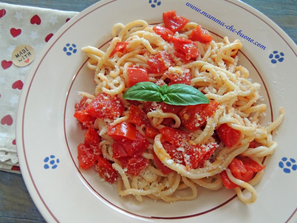 Troccoli pugliesi impastati a mano e realizzati con la “chitarra”, conditi semplicemente con pomodoro fresco, basilico e parmigiano grattugiato (o altro formaggio, pecorino, cacioricotta). Buoni, leggeri, golosi, ideali per un pranzo estivo domenicale.