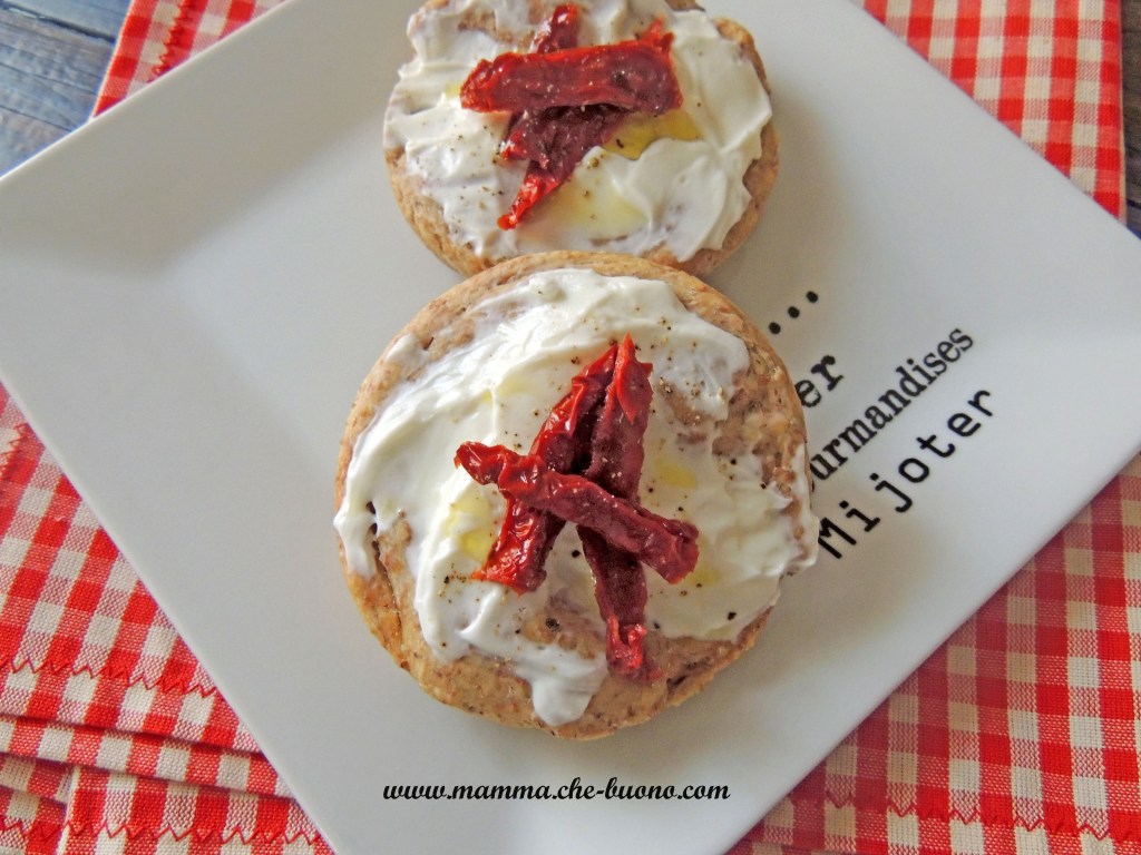 Deliziose e croccanti focaccine, preparate con farina integrale e condite con formaggio cremoso e pezzetti di pomodorini secchi, un filo di olio e pepe. Ideali per un accompagnare un aperitivo o per una cena a buffet.