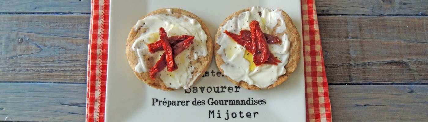 Deliziose e croccanti focaccine, preparate con farina integrale e condite con formaggio cremoso e pezzetti di pomodorini secchi, un filo di olio e pepe. Ideali per un accompagnare un aperitivo o per una cena a buffet.