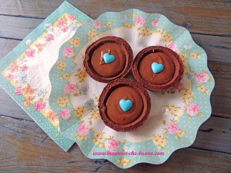 Piccoli gusci di pasta frolla al cacao farciti con crema pasticcera al cacao e guarniti cn un cuoricino di zucchero. Ideali come fine pasto per occasioni varie o per arricchire un buffet di dolcetti monoporzione.