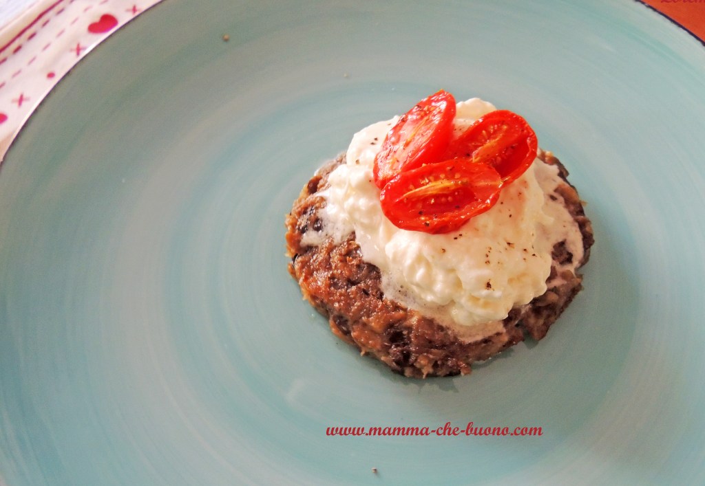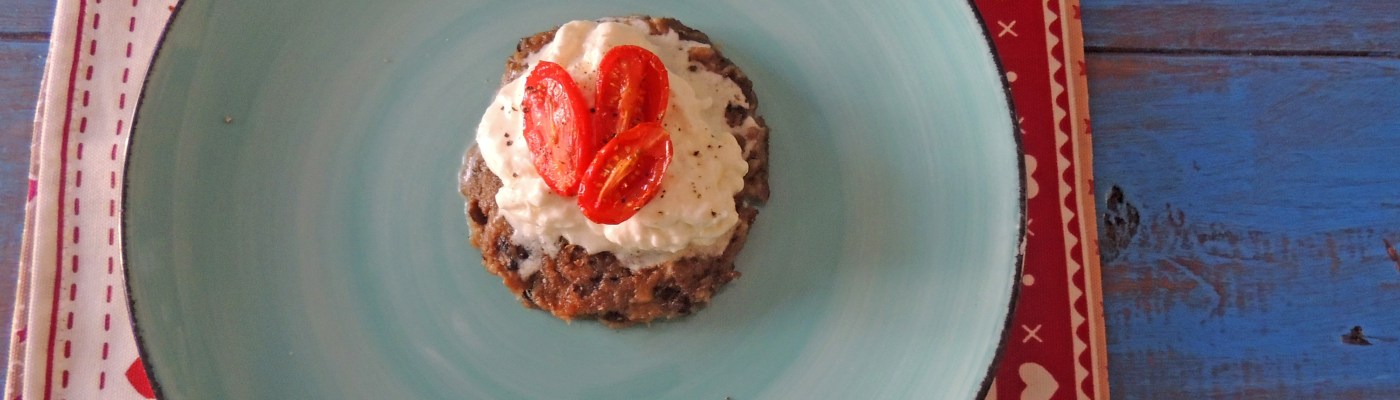 Burger vegetariano, preparato con melanzane, parmigiano e mollica di pane, guarnito con un mucchietto di stracciatella e pomodorini datterini caramellati. Ideale come secondo piatto o piatto unico, servito tiepido è una vera golosità!