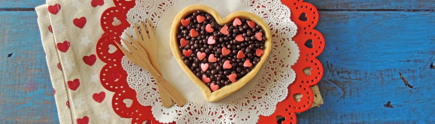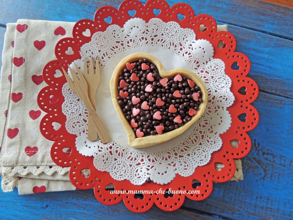 Golose crostatine di pasta frolla, farcite con crema spalmabile al cioccolato fondente, realizzate a forma di cuore (con un apposito stampino di acciaio microforato) e guarnite con palline di cioccolato e cuoricini di zucchero. Ideali da condividere con gli affetti più cari nel giorno di San Valentino.