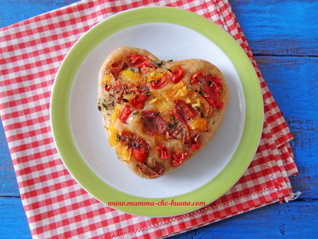 Golose pizzette condite con pomodorini datterini gialli e rossi e origano, realizzate a forma di cuore (all’interno di alcuni stampini di alluminio monouso), sono uno sfizioso finger-food da condividere a San Valentino.