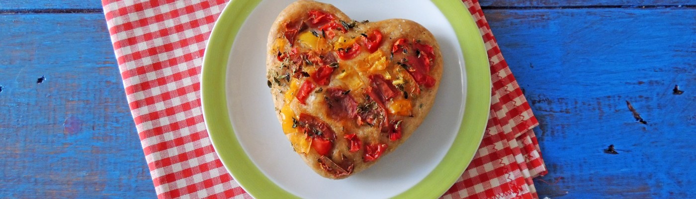 Golose pizzette condite con pomodorini datterini gialli e rossi e origano, realizzate a forma di cuore (all’interno di alcuni stampini di alluminio monouso), sono uno sfizioso finger-food da condividere a San Valentino.