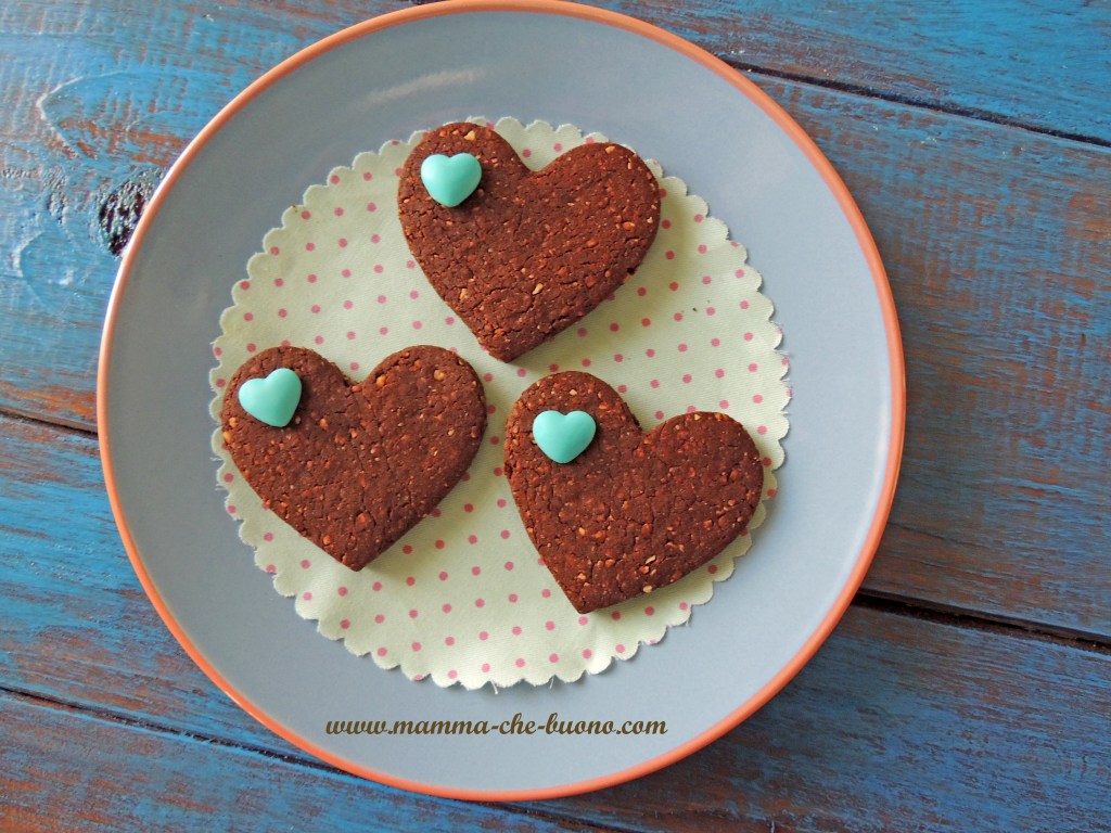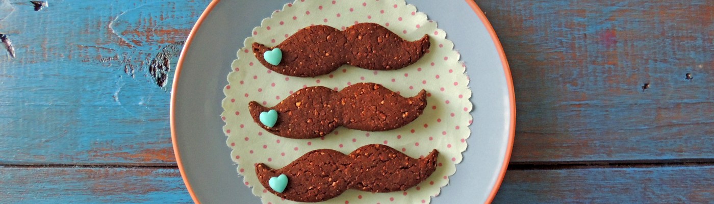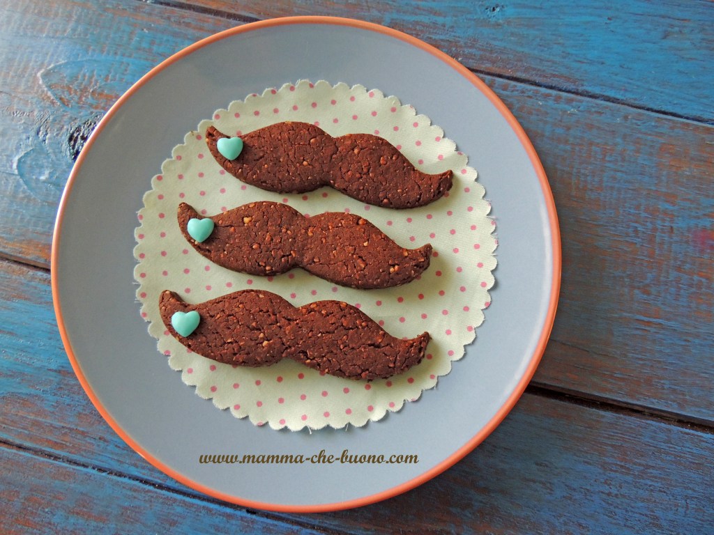 Golosi biscotti al cacao e nocciole tritate, realizzati a forma di baffetti o cuore e decorati con un piccolo cuoricino di zucchero, sono ideali da condividere a colazione per la festa del papà.