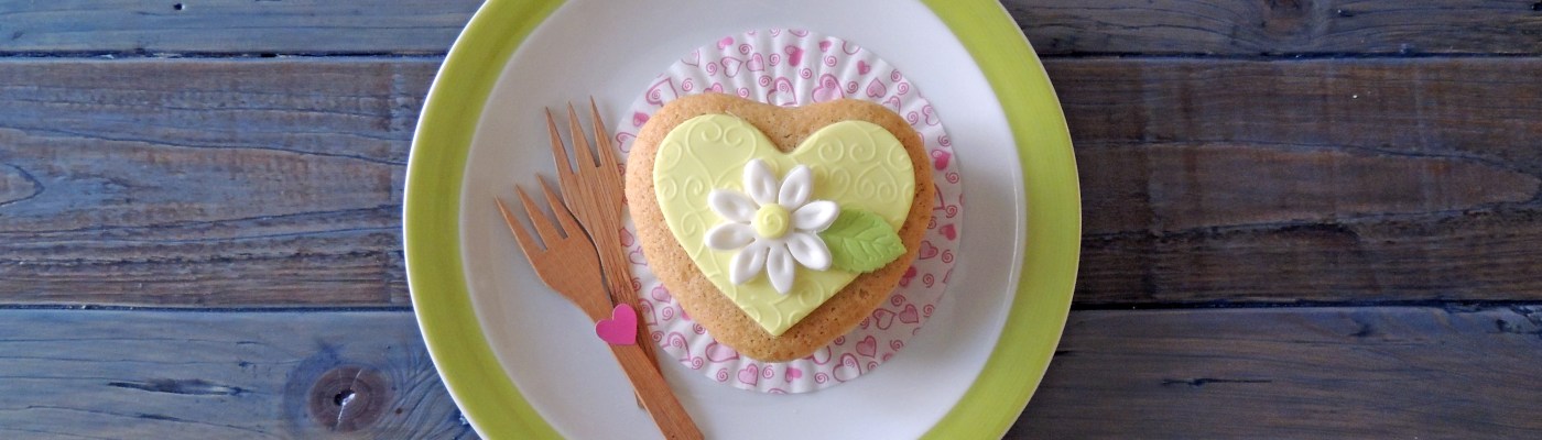 Decorare le tortine con un cuore sottile di pasta di zucchero gialla (realizzato con un mattarello decorativo e ritagliato con un taglia-biscotti a forma di cuore) e una margherita bianca e gialla abbinata ad una fogliolina verde (realizzati con due appositi stampini ad espulsione).