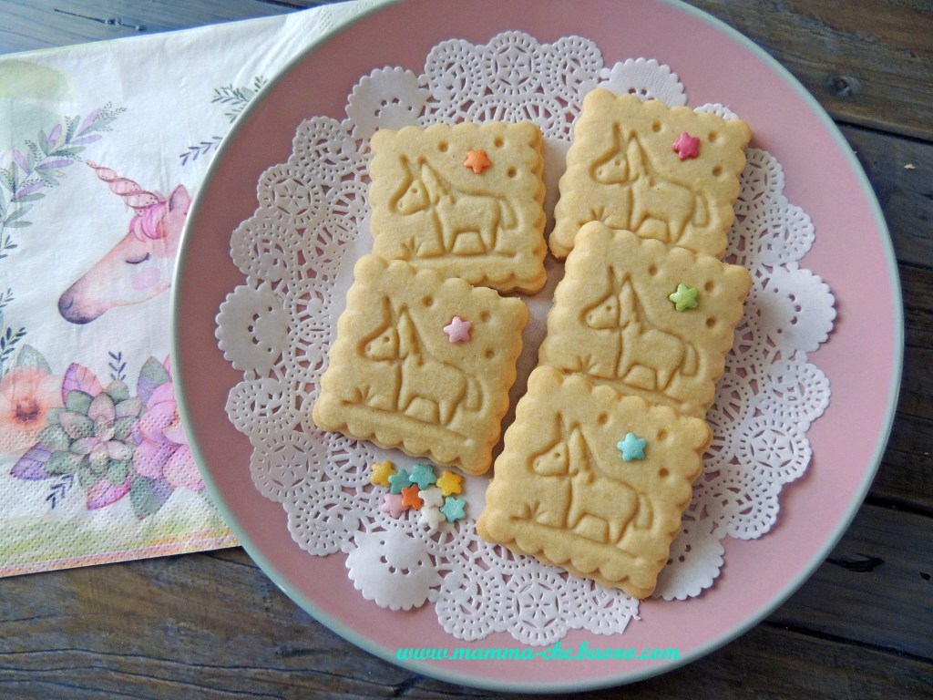 Tradizionali frollini al burro, realizzati con un simpatico timbro in legno per biscotti che raffigura un tenero unicorno, impreziositi da una stellina colorata di zucchero. Sono ideali per accompagnare il tè o per comporre pacchettini regalo per gli amanti degli unicorni.