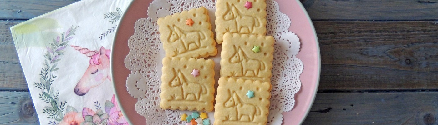 Tradizionali frollini al burro, realizzati con un simpatico timbro in legno per biscotti che raffigura un tenero unicorno, impreziositi da una stellina colorata di zucchero. Sono ideali per accompagnare il tè o per comporre pacchettini regalo per gli amanti degli unicorni.