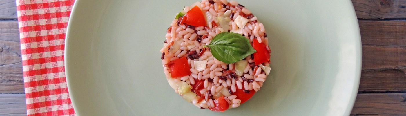 Insalata di riso (mix di riso classico, rosso e venere) condita con una dadolata di pomodorini, cetriolo e scamorza. Primo piatto leggero e freschissimo, ideale per una pausa pranzo, una cena estiva o un pic-nic.