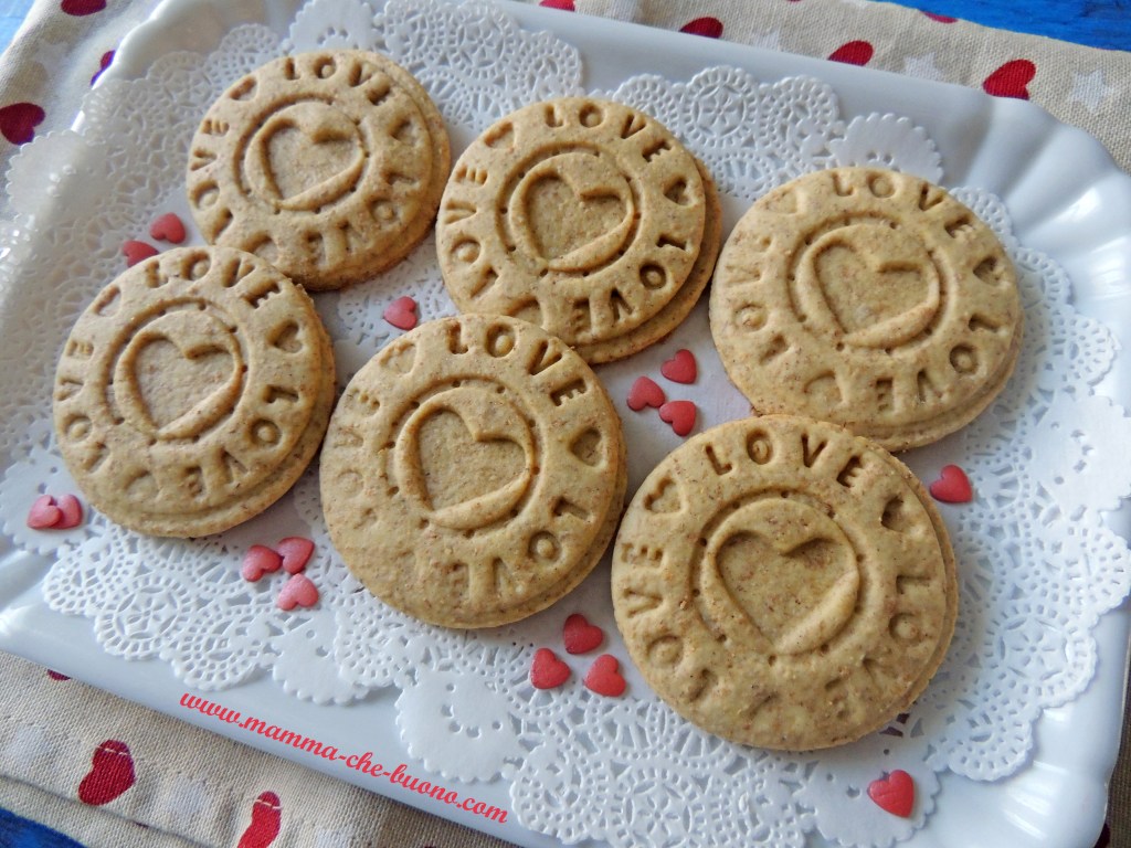 Deliziosi biscotti preparati con farina integrale e profumati alla cannella. Sono ideali per la colazione, per accompagnare tè e tisane (senza burro, perfetti per chi non può consumare latte e derivati). Realizzati con un timbro per biscotti, possono essere confezionati in una scatolina o in sacchettino per la festa di San Valentino.