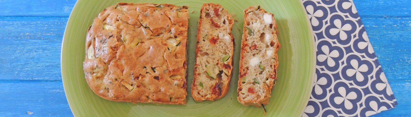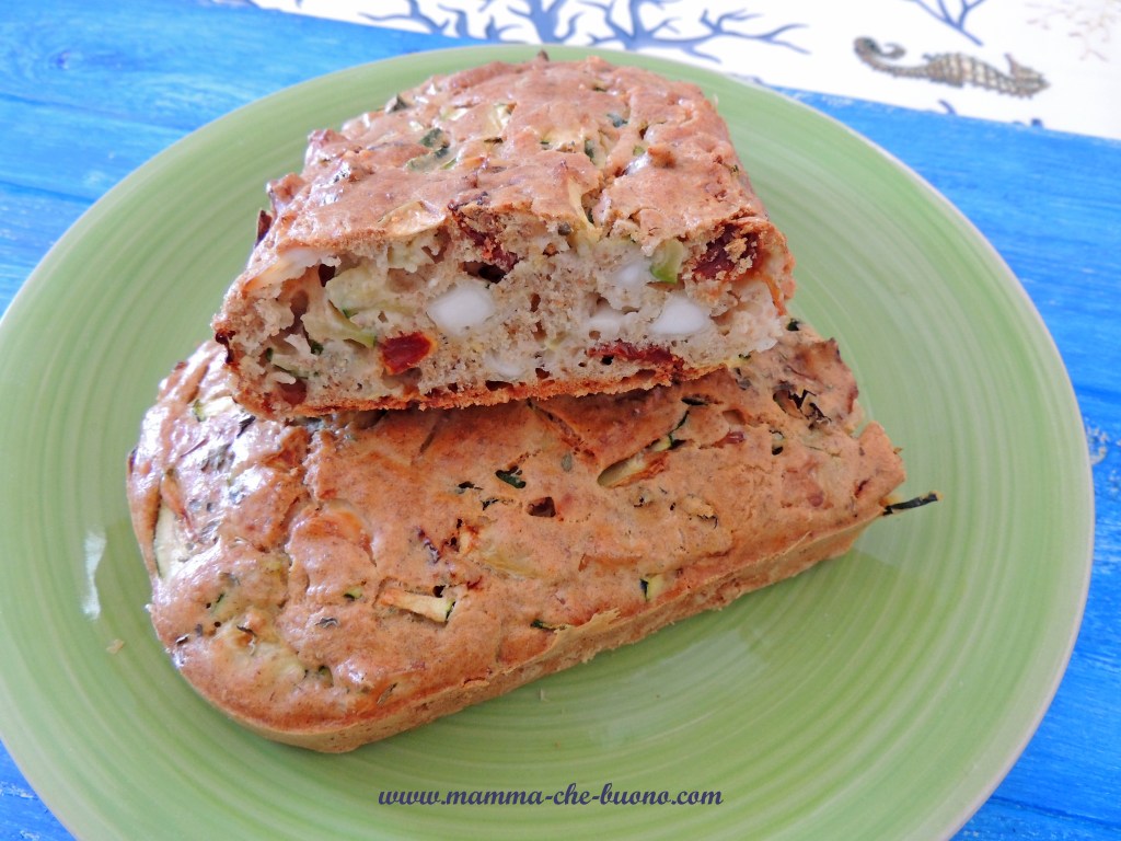 Soffice plum-cake salato preparato con farina integrale e farcito con zucchine, pezzetti di formaggio primo sale e pomodorini (datterini) secchi. Invitante e goloso, diviso in fette o in quadratini è ideale per un pic-nic, un aperitivo o una cena saporita.