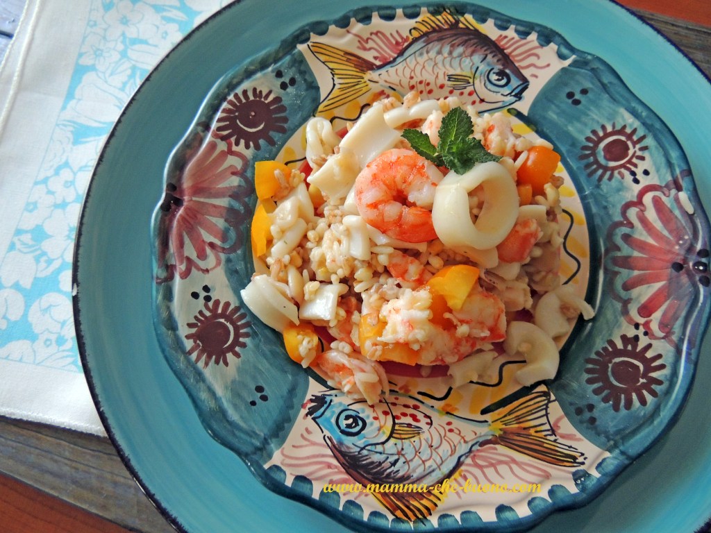 Mix di cereali (orzo, riso, farro e grano) condito con pezzettini di gamberi, calamari e datterini gialli, insaporito con una profumata emulsione di olio, limone e menta. Primo piatto delizioso e fresco, ideale per un pranzo o un pic-nic estivo.
