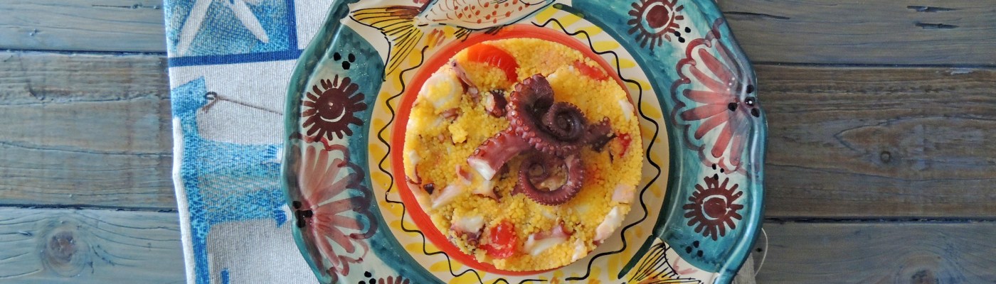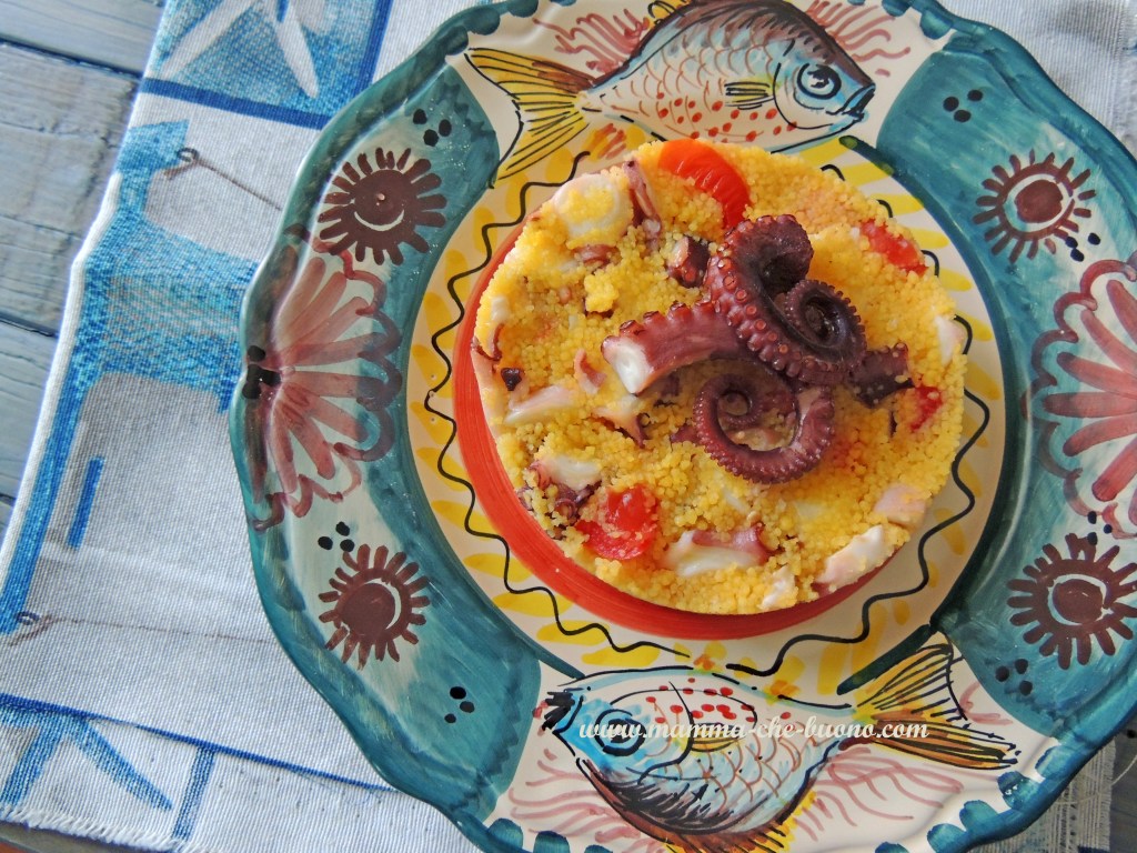 Delizioso cous cous di mais (senza glutine) condito con pezzettini di polpo lesso, pomodorini, olio, succo di limone e foglioline di basilico. Fresco, leggero e invitante è un primo piatto ideale da servire per un pranzo, una cena o un pic-nic estivo.
