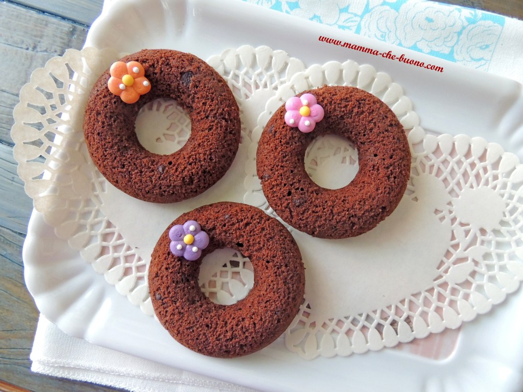 Soffici ciambelline al cacao, ideali per la colazione o la merenda. Impreziosite da un piccolo fiorellino di zucchero, sono ideali anche per comporre una scatolina regalo.