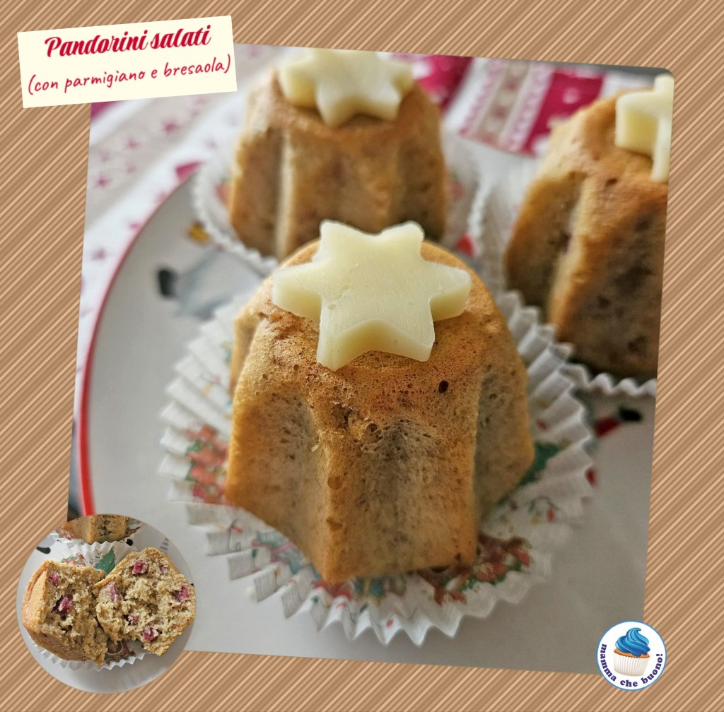 Soffici e golosi tortini (realizzati in uno stampo multiplo per pandorini) farciti con parmigiano e dadini di bresaola. Ideali da portare in tavola, come antipasto o sfizioso finger-food in occasione delle festività natalizie.